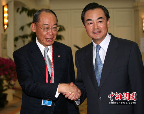 中共中央台办、国务院台办主任王毅4月10日在海南博鳌为前来出席博鳌亚洲论坛2010年年会的台湾两岸共同市场基金会最高顾问钱复一行举办招待酒会。中新社发 王辛莉 摄