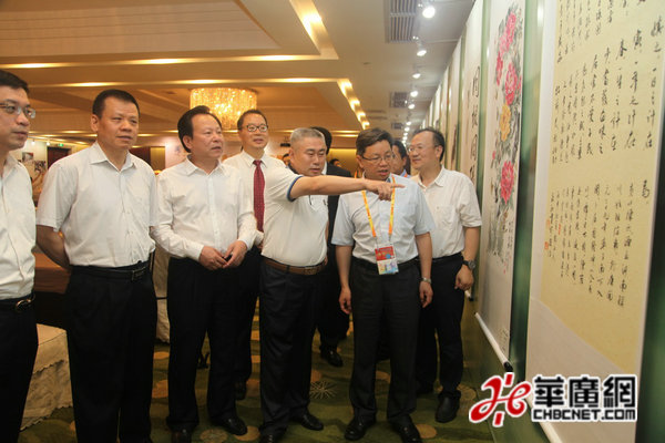 参加第八届海峡论坛“同名村 心连心”联谊活动开幕式的嘉宾参观中华情 两岸缘同名(同宗)村书画作品展。 (华广网吴勇摄)