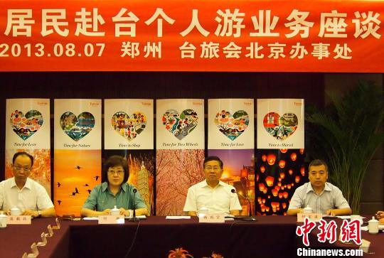 今年6月28日,郑州正式启动赴台个人游。台旅会北京办事处8月7日邀请河南省旅游协会、郑州市旅游协会、组团社及航空公司等业界代表参与座谈会,以推动更多当地民众赴台旅游。