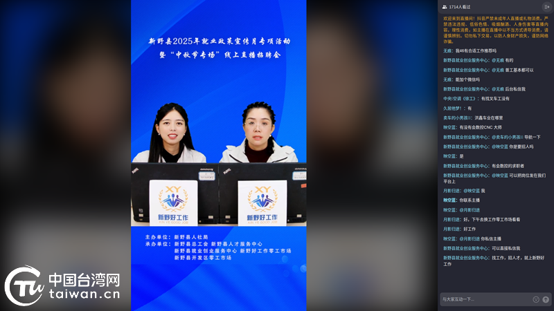 中国台湾网10月10日讯 月圆人团圆,职等你来圆。为助力企业解决用工难题,搭建高效就业供需对接平台,10月5日,南阳市新野县举行“2025年就业政策宣传月专项活动暨中秋节专场招聘会”台资企业直播招聘会,以“直播带岗”形式,为企业与求职者牵线搭桥。