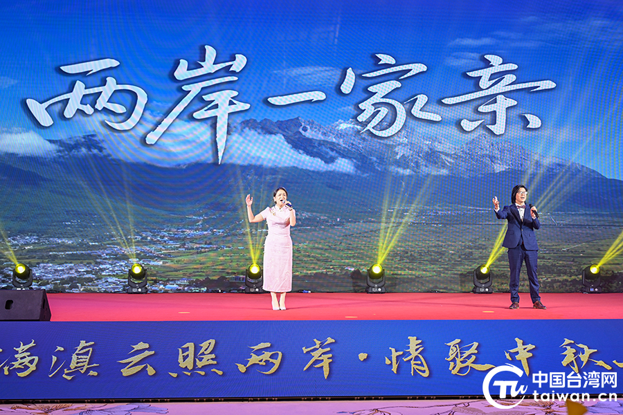 台胞游纯瑜与丽江教师谢学飞夫妻在2025云台中秋茶话会现场演唱《两岸一家亲》歌曲(中国台湾网发)