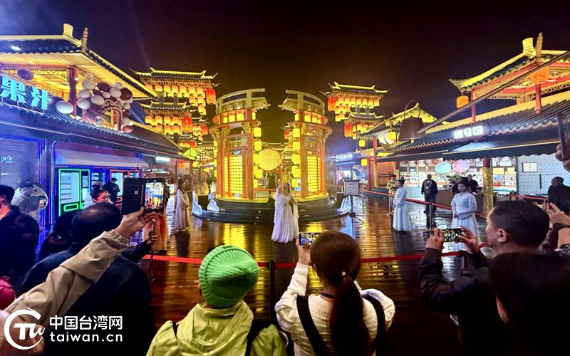 台湾旅行商们在广安不夜城里驻足拍照。(中国台湾网发)