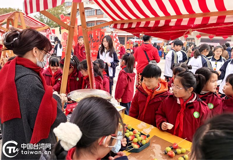 杭台青少年围聚在串制冰糖葫芦的摊位前。(中国台湾网发)