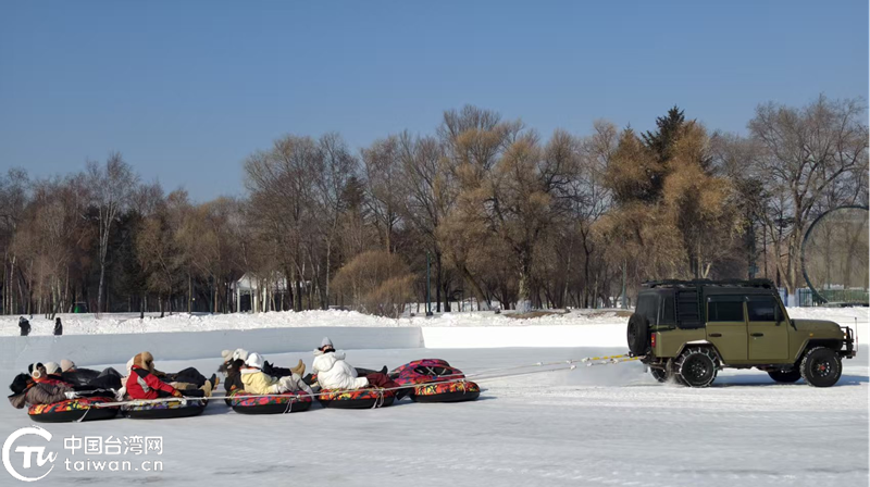 营员在太阳岛雪博会体验滑雪圈。(中国台湾网发)