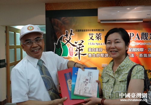 广西卫生厅副厅长夏宁(右)向花莲观光养生馆相关负责人赠送近年来广西医药著作成果。(图片来源:广西台办)