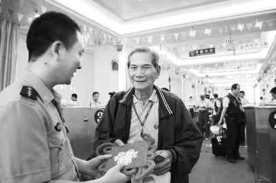 今年是妈祖诞辰1050周年,首个以整船、包船形式赴妈祖故乡朝圣的台湾进香团352名台胞,6月18日乘坐“海洋拉拉”号客轮从台湾台中港出发,于中午1时抵达福建莆田湄洲岛宫下新码头。83高龄的台胞蔡明森是352名旅客中年龄最大的,刚踏进验放通道,他就收到莆田边防检查站官兵送上的礼物——中国结。 吴志 摄