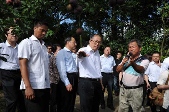 5月27日,李鸿忠在苗栗农户涂兆荣的果园参观