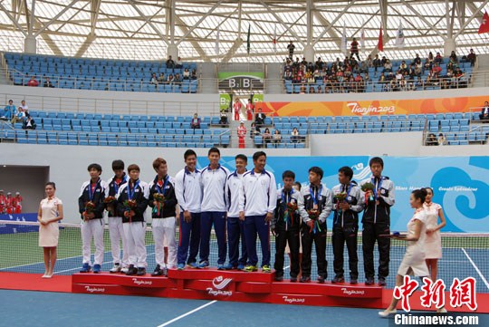 第六届东亚运动会网球项目男女团体决赛10月7日在天津国际网球中心进行,中华台北队男、女团体分别战胜韩国男子团体和中国女子团体,为中华台北代表团赢得双金。