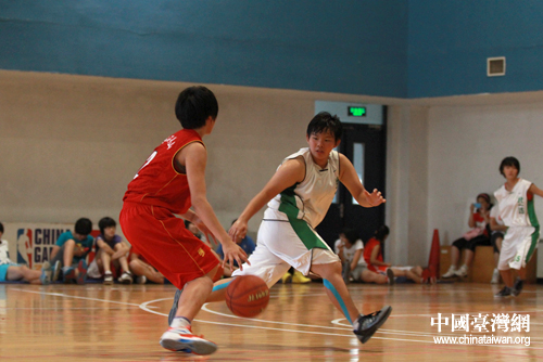 24日下午,北京青年女篮与台湾台北女子第一高中女子篮球队展开一场跨越海峡的友谊赛。图为双方队员在场上激烈争夺。(中国台湾网 普燕 摄)
