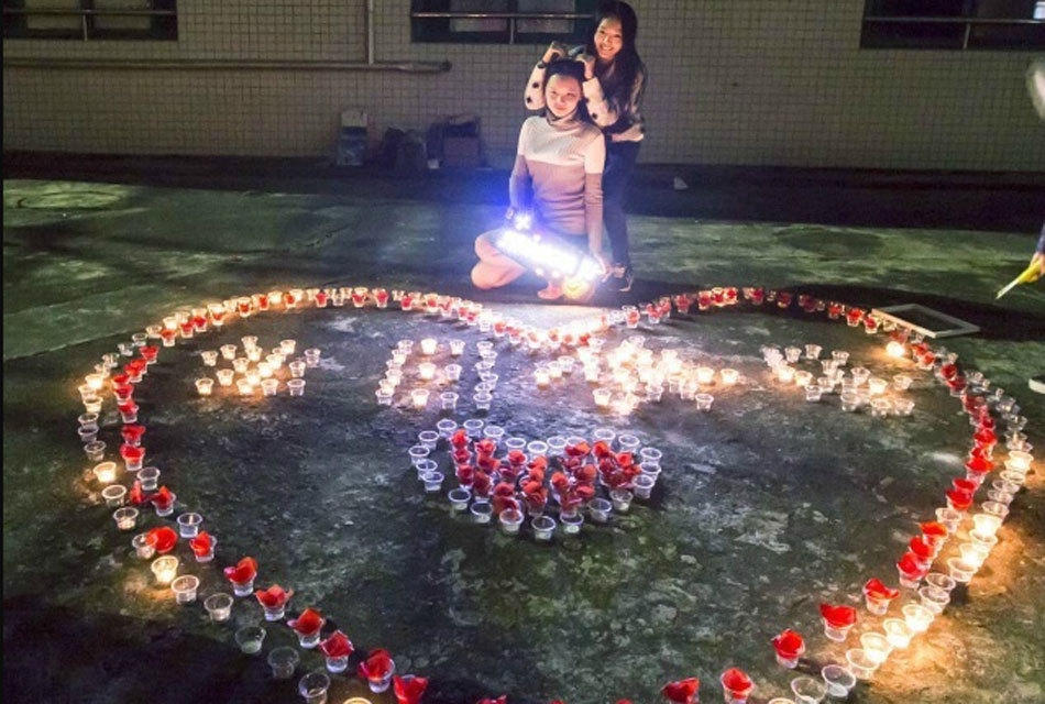 16日零点,广东财经大学海珠校区上演着温情的一幕:寒风中,几百个小烛杯排成爱心的形状。