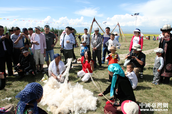 台湾旅游节目达人吕忆雯(红衣者)体验抽打羊毛。(中国台湾网 王怡然 摄)