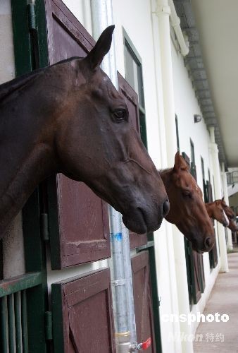 六月十二日,香港赛马会双鱼河马场赛马云集,很多赛马从马厩中探出脑袋。香港成为北京奥运会马术比赛项目协办城市后,有着雄厚实力与丰富经验的香港赛马会即投入十二亿港币,兴建奥运马术比赛场馆并参与赛事相关工作,对奥运马术比赛充满期盼并信心十足。 中新社发 孙自法 摄
