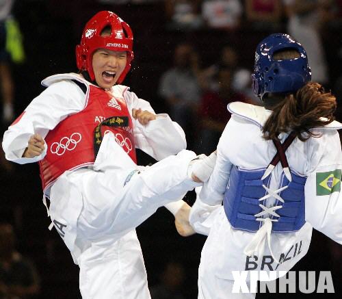 2004年8月29日,中国选手陈中(左)在雅典奥运会跆拳道女子67公斤以上级半决赛中,战胜巴西选手席尔瓦,进入决赛。新华社发(资料图片)