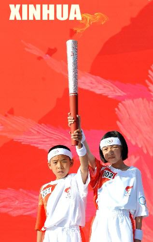 6月10日,奥运火炬手和震生(左)与张紫兰在起跑仪式上共同举起点燃的火炬。当日,北京奥运圣火在云南丽江传递。 新华社记者邹峥摄