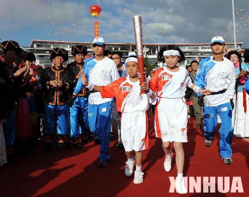 6月10日,奥运火炬手和震生(左)与张紫兰共同手举火炬传递。当日,北京奥运圣火在云南丽江传递。 新华社记者刘力航摄