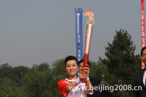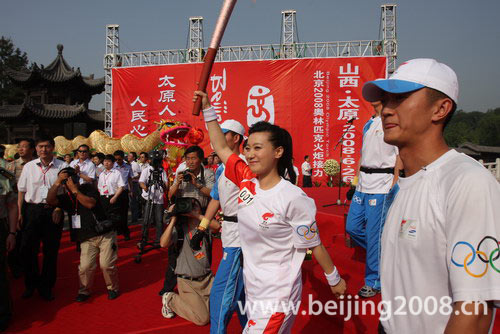 山西籍的著名歌手谭晶成为第一名火炬手,领跑“龙城”奥运火炬接力