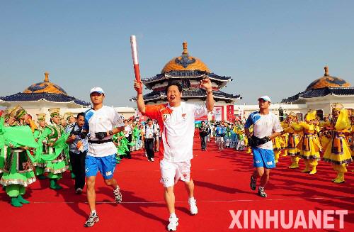 7月9日,第一棒火炬手哈斯劳进行传递。当日,北京奥运圣火在内蒙古自治区鄂尔多斯市传递。 新华社记者刘力航摄