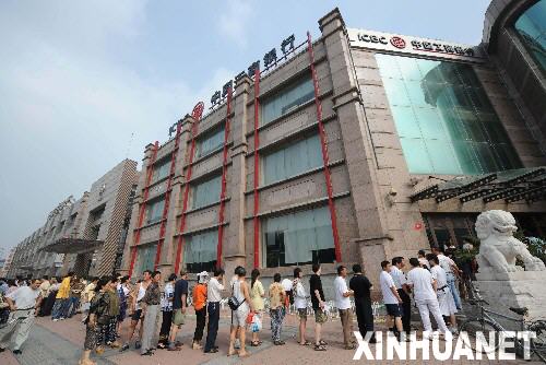 7月9日,在北京崇文区三里河地区一家银行营业点外,准备兑换10元奥运纪念钞的市民排起了长队。当日,北京市5家商业银行约300个营业网点面向社会办理奥运纪念钞兑换发行工作。 新华社记者 罗晓光 摄