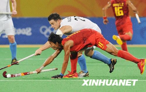 8月17日,中国队球员陆锋辉(红)与对手争抢。当日,在北京奥运会曲棍球男子小组赛中,中国队2比2战平新西兰队。 新华社记者李勇摄