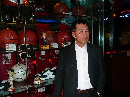王宁部长在姚餐厅姚明珍贵纪念品陈列橱前留影。美国《明桥体育》供图 / 许阳 言心 摄影