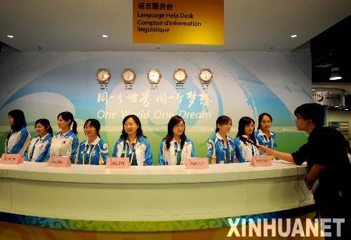 7月8日,一名记者在主新闻中心(MPC)大堂的语言服务台采访。当日,北京2008年奥运会主新闻中心正式启用。 新华社记者罗晓光摄