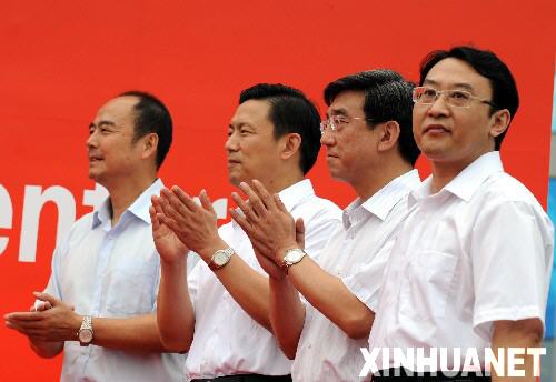7月8日,北京奥运会四位新闻发言人与媒体见面。他们分别是北京奥组委执行副主席王伟(左一)、国务院新闻办公室一局局长郭卫民(左二)、北京市政府副秘书长李伟(左三)、刘志。 新华社记者李文摄