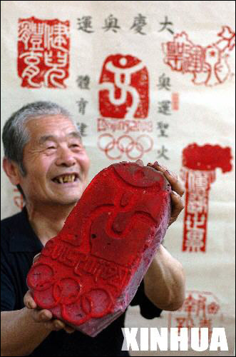 山东省淄博市临淄区梧台镇王青村的七旬老人王天德历时一年半,用八块青砖刻制的大型组合“奥运情”刻章于近日完成。老人精心打磨的这八块印章中包括“奥运圣火传递世界报喜讯、体育健儿志在全球创辉煌”等内容。 这是王天德老人在展示用青砖刻制好的“中国印”(5月24日摄)。 新华社记者范长国摄