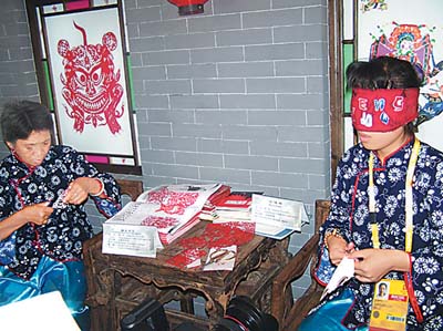 62岁的王庆汝操演的“速剪”和新绛福山特色第三代剪纸艺术传承人郑平带来的 “盲剪”,艺高技绝,引来现场阵阵惊叹(见上图)。在“大红灯笼高高挂”的豪宅大院旁,只见她们灵动的双手飞剪走纸,几分钟内一朵栩栩如生的莲花就跃然纸上。剪刀下的艺术倾注了山西人特有的情思,朝夕相伴的剪纸刻画了古老的生活印迹。