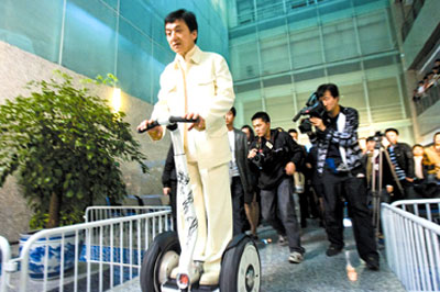昨晚,国际影星成龙骑着一辆新颖的两轮电动车出现在奥运临时设施新产品发布会上,这款只用锂电电池作为动力的智能环保车将在北京奥运会赛时应用在“鸟巢”、奥运村等奥运场馆以及非竞赛场馆内。