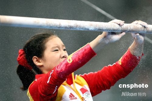 | 8月7日,中国体操队女队在北京国家体育馆内进行赛前训练。图为程菲在高低杠前做准备工作。 中新社发 盛佳鹏 摄 |