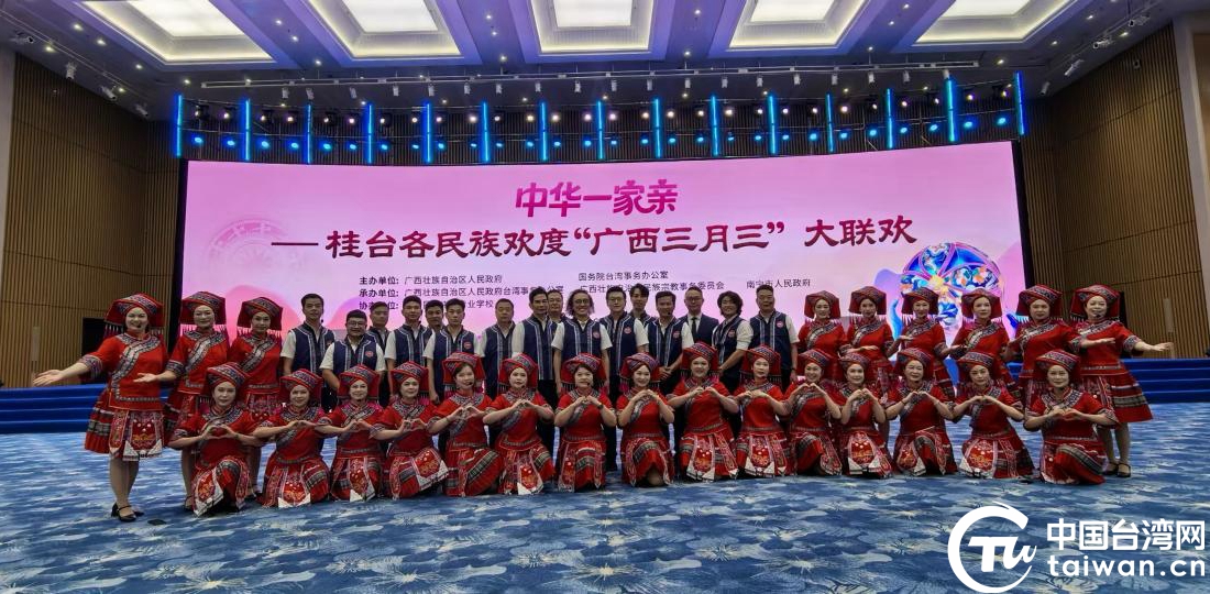 两岸同胞在“中华一家亲——桂台各民族欢度‘广西三月三’大联欢”活动现场拍照留念。(中国台湾网发)