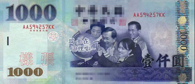 “新”台币将千元钞上“四个小朋友”的图案,换成涉贪的前台湾地区领导人陈水扁一家四口人的肖像。当年陈水扁把钱贪污后存在瑞士,所以钱币上陈水扁一家正在地球仪上找瑞士(网络图)