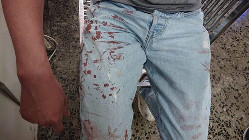 孙男右腋遭对方弹簧刀割伤,衣服裤子染血。(图片来源:台湾“中时电子报”)