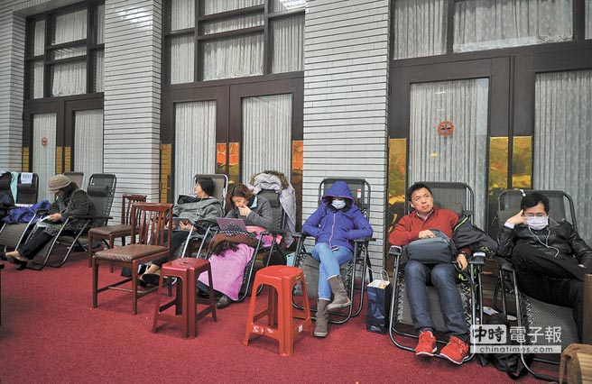 为防止在野党案海攻势,“绿委”们冒着寒流在“立法院”议场门口轮班排队。(图片来源:台湾《中时电子报》)