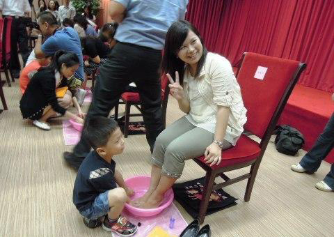 表扬模范人员暨庆生会活动现场,节目一开台便由该部门员工带着自己的小孩上台帮父母洗脚。王建煊说,以前是同仁过生日,邀父母来洗脚,现在是带自己的小孩来替寿星洗脚,这也很有意义。