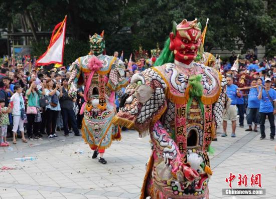 10月25日,多个民间团体在台北中山堂、凯达格兰大道等地举办庆祝台湾光复70周年活动。其中,中华统一促进党在中山堂广场祭祀两岸抗日烈士英灵,祈愿两岸和平团圆,并结合各地民间信仰团体在传统老城区举办巡游活动。(中新社记者 任海霞 摄 )