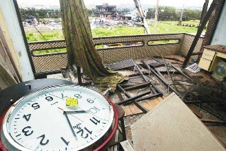 苗栗县后龙镇地下爆竹厂昨天爆炸,工厂60米外的一户民宅,屋顶门窗全毁,屋内时钟还停留在爆炸发生时的10时3分。《联合报》记者陈易辰摄