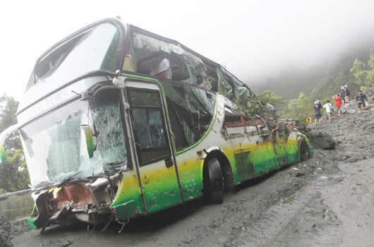 苏花公路112.8公里处一辆被砂石击中的游览车23日被挖出后,车体支离破碎,显示冲击力道之大。来源:台湾《联合报》