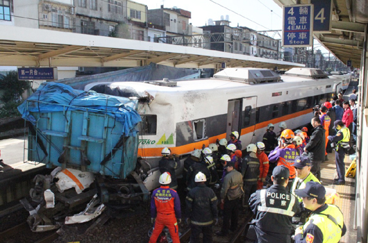 中国台湾网1月17日消息 据台湾《联合报》报道,台铁太鲁阁号17日上午8时42分行经桃园埔心站时,有砂石车闯越平交道,造成太鲁阁号与砂石车对撞,列车前三个车厢出轨,砂石车则被拖行近500米,才在埔心火车站停下,目前共有8男14女、共22人受伤。不幸的是,太鲁阁号列车司机蔡崇辉不幸在送医途中伤重不治,砂石车驾驶则被警方带到杨梅分局侦讯中。