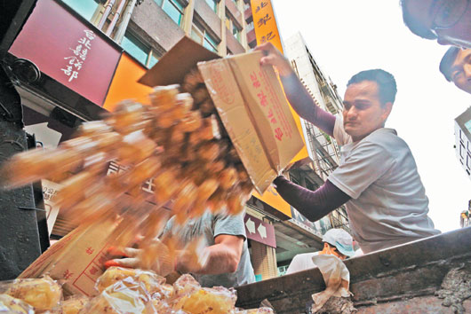 台北犁记16日销毁回收的8000多公斤糕饼,统统载到木栅焚化炉处理,业者心中不舍。