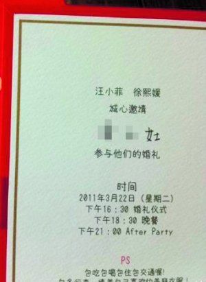 早前一直有传,大S、汪小菲将于3月22日海南三亚举行婚礼,昨日终于有人贴出两人婚宴请帖,上面标明的日子果然是3月22日。请帖上的内容透露,当天下午16点30分为婚礼仪式,18点30分开始晚餐,而晚21点则是餐后聚会(After Party),有网友猜测这个聚会应该是大小S姐妹淘的狂欢时刻。大S的喜帖非常有特点,除了正常的时间外,上面还注明“包吃包喝包住包交通喔!”但要求宾客“自备行李,请着自己喜欢的美丽衣服!”