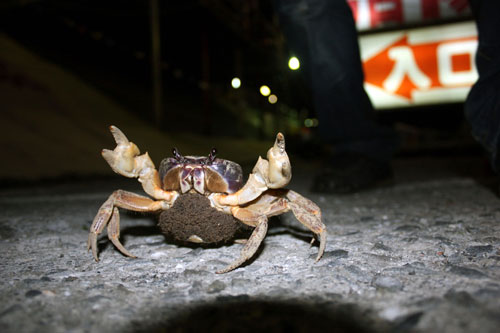 正值台湾垦丁公园陆蟹产卵高峰期,陆蟹妈妈到海边产卵须穿越马路(如图),常被来往车辆辗毙,垦丁公园管理处2010年实施缩减车道,保护陆蟹降海释卵。图片来源:“中央社”
