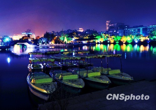 资料图:放眼两岸彩灯盏盏溢彩,河上水灯万盏流金,灯光映水,水染灯色,烟水淼淼,灯影迷离,“桂林山水甲天下”,此言不虚。中新社发 滨海之光 摄