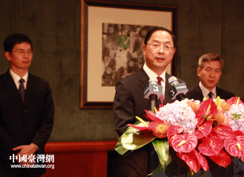 经合会大陆首席代表、海协会特邀顾问蒋耀平(中)在经合会第二次例会后媒体见面会上。(中国台湾网 李杰 摄)