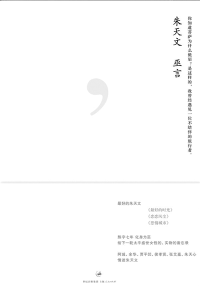 上海人民出版社昨天透露,台湾作家朱天文最新长篇小说《巫言》简体版已由该社引进出版。朱天文写《巫言》耗时7年,小说以“菩萨低眉”的意向展开,以“我”(主人公巫)的生活场景为主线,贯穿了许多当下的物与事。