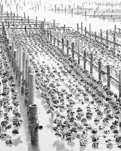 东石乡是全台湾最大的产蚵地,每年4至6月是蚵仔最丰产的季节。近海处,一根根木桩打进海床,彼此间缚着尼龙线,每条线串10只蚵壳。渔民说,海里的蚵仔苗会自动附着到蚵壳上,长出另一片壳,一年之后方可采收。