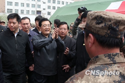 4月18日,中共中央总书记、国家主席、中央军委主席胡锦涛飞抵玉树,看望慰问地震灾区干部群众,实地指导抗震救灾工作。 中新社发 盛佳鹏 摄