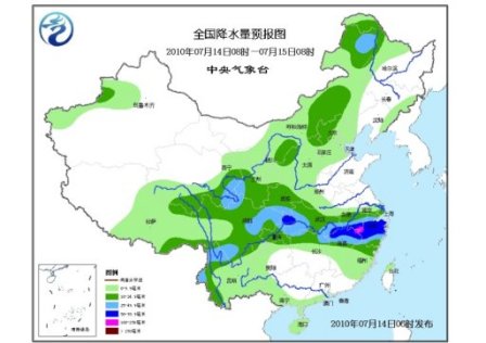 14日08时至15日08时,新疆西部的部分地区、西藏中东部、西北地区中东部、内蒙古西部偏东地区和中东部、黑龙江西部、吉林东部、辽宁西南部和东部、华北大部、黄淮西部、江淮西部、江汉、江南中东部和西北部、西南地区大部、广东西南部和东北部、广西西部和南部、海南、台湾北部等地有小到中雨或阵雨,其中,湖南北部、湖北西部和东南部、安徽南部、江西北部、浙江大部有大到暴雨,局部地区有大暴雨;四川东北部、重庆北部、陕西南部、云南西北部、青海东部、甘肃西南部、川西高原东北部和南部、内蒙古东北部等地的部分地区有大雨、局地暴雨;上述局部地区并伴有短时雷雨大风等强对流天气。新疆西部、甘肃河西地区东部、内蒙古中部等地有4~6级风。受强热带风暴“康森”影响,南海中北部偏东海域、台湾以南海域有7~9级大风;“康森”中心经过的附近海面风力可达10~12级。黄海南部有5~6级、阵风7级的东北风;东海北部有6~7级、阵风8级的旋转风。