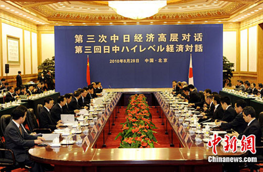 8月28日,第三次中日经济高层对话在北京人民大会堂举行。中国国务院副总理王岐山、日本外相冈田克也等出席。中新社记者 刘震 摄