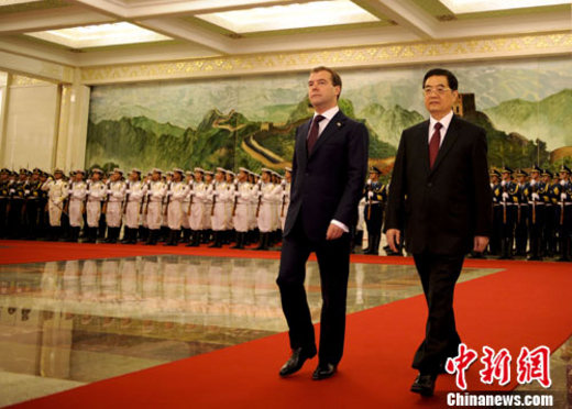 9月27日,中国国家主席胡锦涛在北京人民大会堂举行仪式欢迎俄罗斯总统梅德韦杰夫访华。中新社记者 廖攀 摄